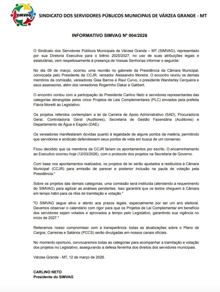 O Sindicato dos Servidores Públicos Municipais de Várzea Grande – MT (SIMVAG), representado por sua Diretoria Executiva para o biênio 2025/2027, no uso de suas atribuições legais e estatutárias, vem respeitosamente à presença de Vossas Senhorias informar o seguinte: No dia 09 de março, ocorreu uma reunião no gabinete da Presidência da Câmara Municipal, convocada […]